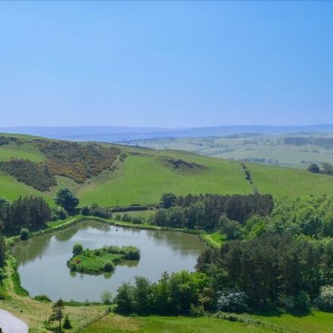 The lake view cabin is situated on the edge of a lovely four acre woodland with nature walk and has breath-taking views over the three acre lake with island and surrounding hillsides.